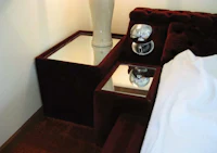 There are also 4 mirror top bedside tables too! Two of which nestle right in on top of the side rails there. Insane.