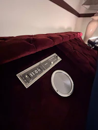 This one is queen size. All original burgundy velvet upholstery. The headboard is tufted and features an AM/FM clock radio in the center and two chrome eyeball lamps! Say what!!??