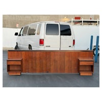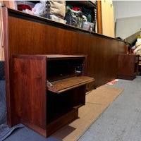 WALNUT!! We don't get many walnut beds and this one is really neat! I believe it's by Dillingham. The lonnng headboard and nightstands are attached so it's all one piece. It can fit a standard king or California king bed (measures 80.5" between the nightstands). The nightstands have a lil drop down door instead of a drawer!