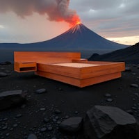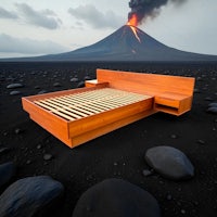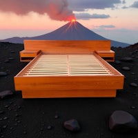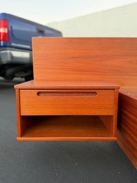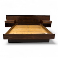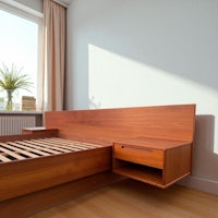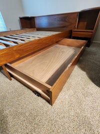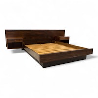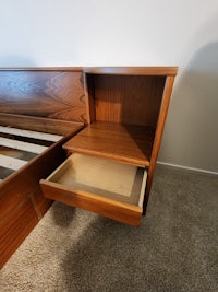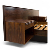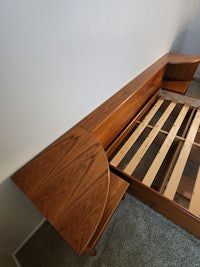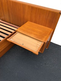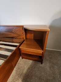 Teak wood chosen for these pieces has a really special flame pattern to the wood grain figuring on the headboard and nightstands! There is one large storage drawer that rolls under the bed. The bed can be configured to have to the drawer on either side. The nightstands are curved along the top edge and run congruent with the headboard.