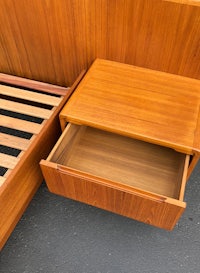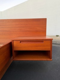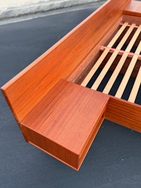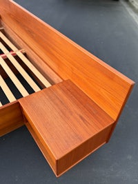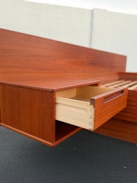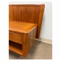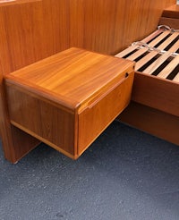 Vintage Danish Modern Teak Queen Platform Bed by Tørring Møbelfabrik. The floating nightstands each have one dovetailed drawer. The teak wood chosen by Torring always has the nicest grain and takes on a beautiful deep amber patina as the pieces age.