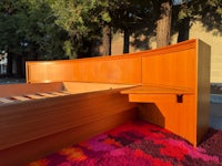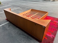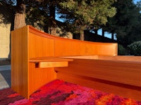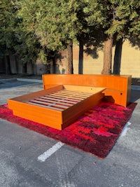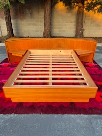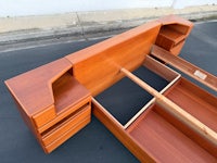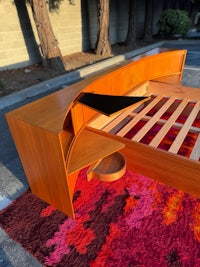 Mid Century Danish Modern teak Queen size platform bed with an absolutely killer design aesthetic! The nighstands are integrated into the long curved headboard, creating a cozy sleeping nook with lots of neat features! Slide open the tambour door to reveal concealed storage in the corners of the nightstands-and above, pull the rosewood tab to slide out a boomerang shaped tray table- but that's not all!-
