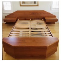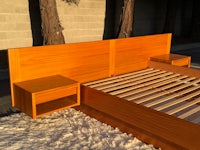 This beautiful teak bed features floating nightstands that attach to the long one piece headboard. Fits a standard queen size mattress. No box spring needed, just slide the mattress right over the bed slats!